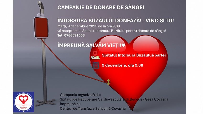 Marți, 9 decembrie 2025, începând cu ora 9:00, locuitorii din Întorsura Buzăului și zonele învecinate sunt invitați să participe la o acțiune de donare de sânge care se va desfășura la spitalul local. Evenimentul face parte din campania „Împreună salvăm vieți!”.